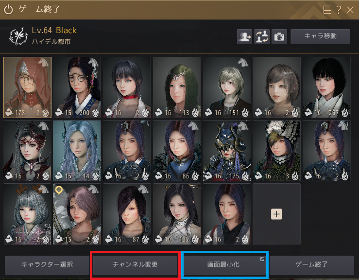 この方法だとキャラも変更でき、またバグった時などキャラクター選択画面に戻る事ができ(通称リログ)、画面最小化がここでも押せるので